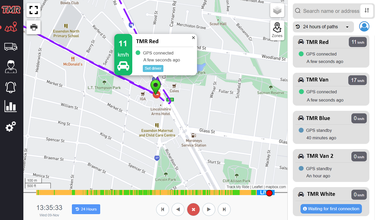 💡 Want to focus on one vehicle? Click its card to enter playback mode and the map will centre on it